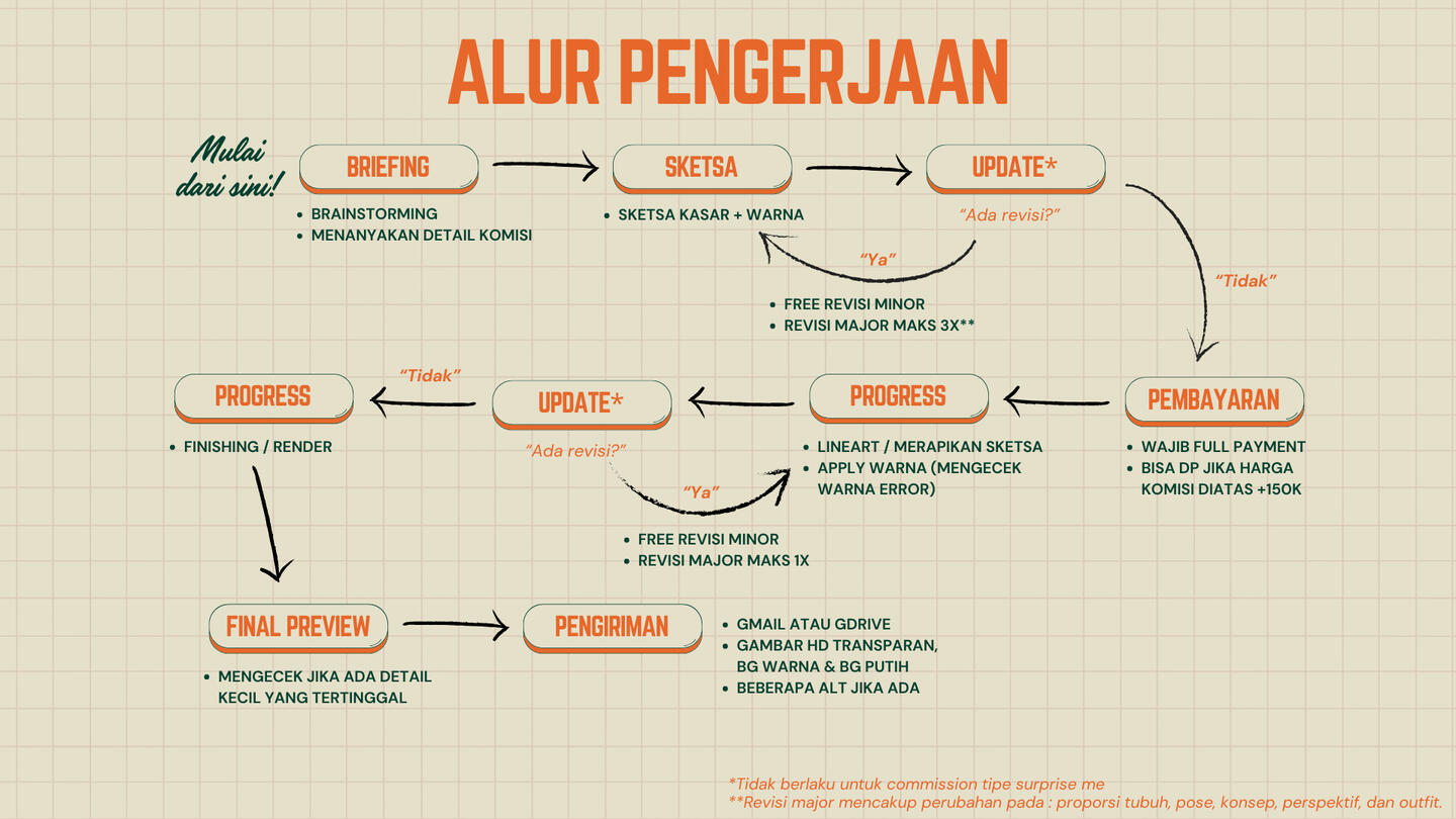 Free revisi minor pada tahap sketsa kasar (jika belum fix tapi mohon jelaskan secara detail T-T) dan base color. Revisi major maks 3x hanya pada tahap sketsa kasar dan 1x untuk tahap selanjutnya (base color dan render) lebih dari itu dikenakan biaya tambahan 50k. Revisi major mencakup perubahan pada : proporsi tubuh, pose, konsep, perspektif, dan outfit.
