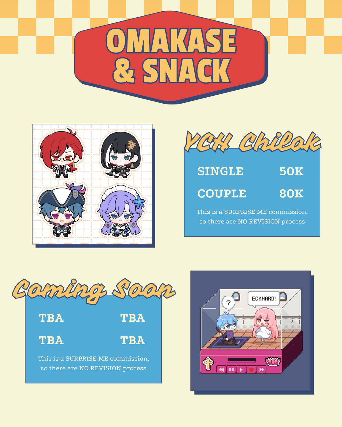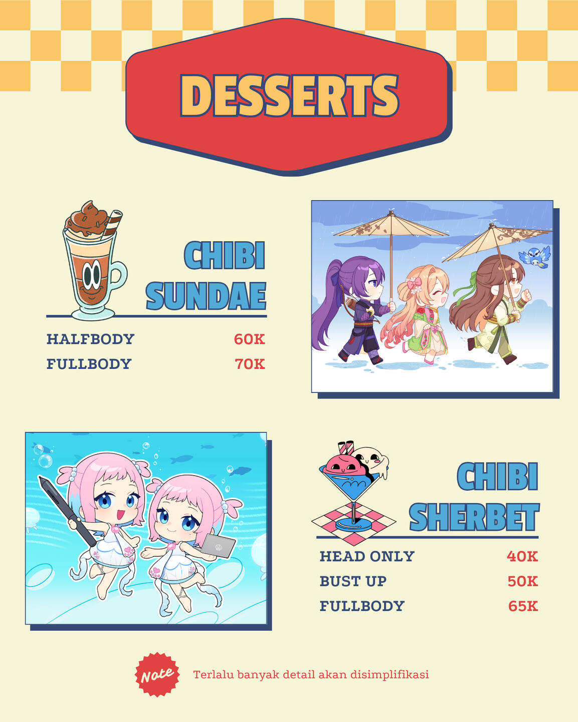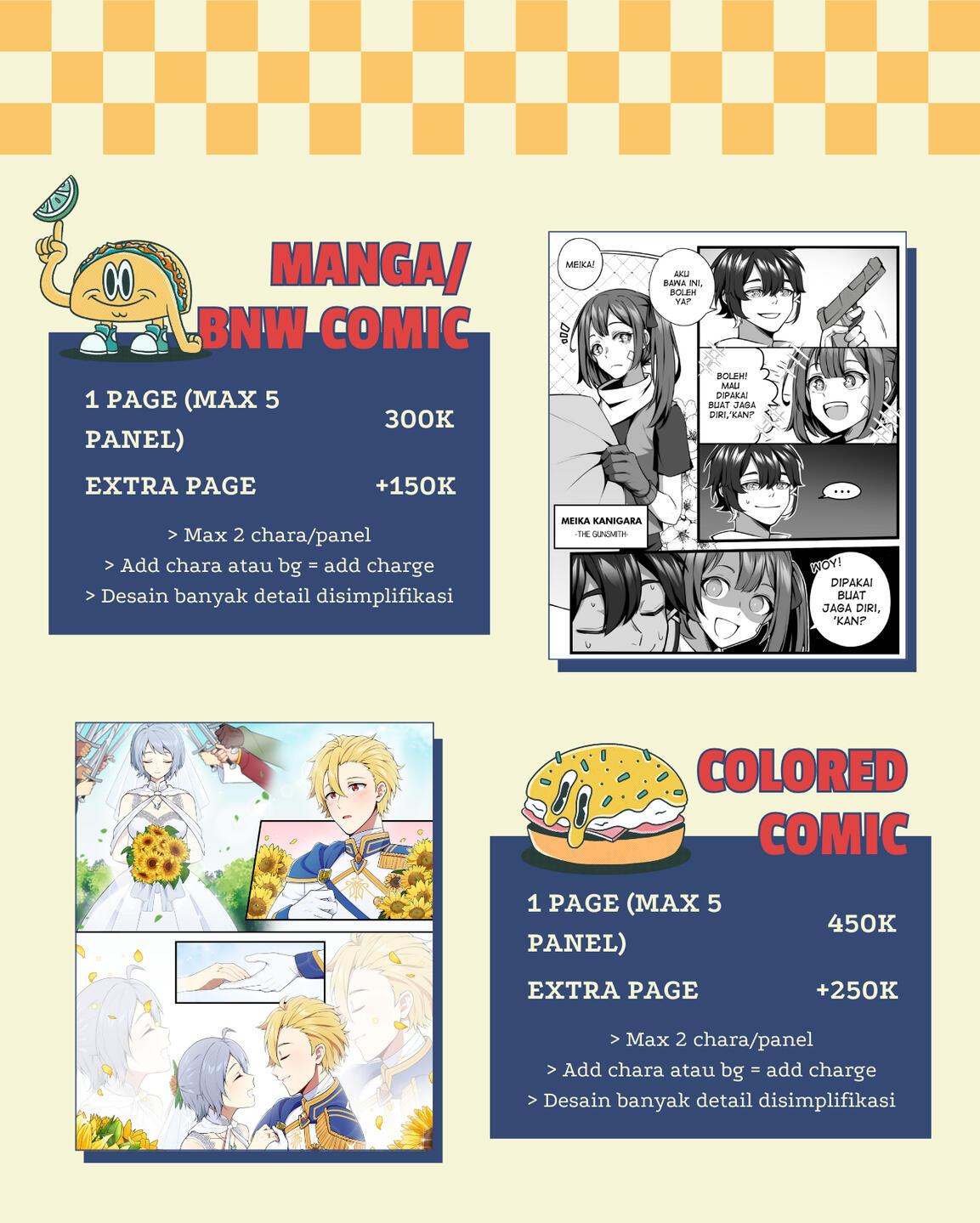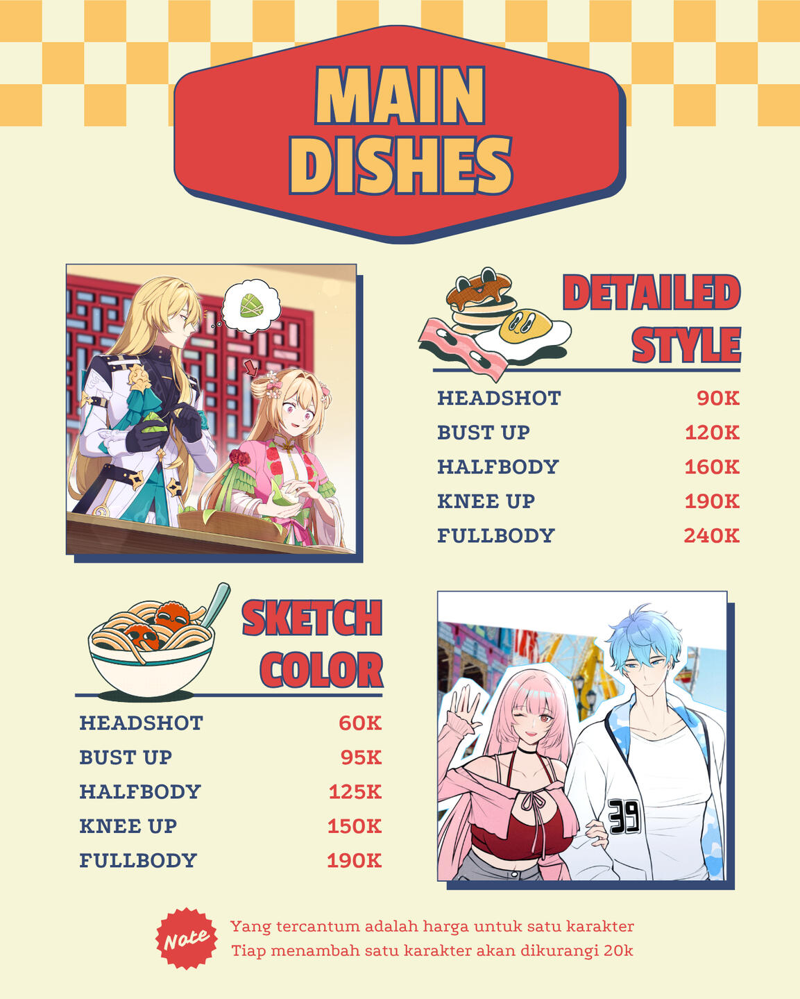 Semua harga yang tertera hanya untuk personal use. Untuk promotional commercial use dikenakan 2x dari harga dasarnya, khusus merchandise commercial use yang bersifat monetisasi dikenakan 2.5x (beli putus, jadi buyer bebas cetak & jual berapapun pcs-nya)